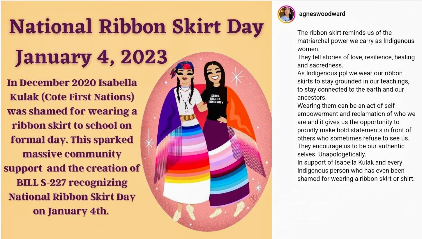 I asked him about braids with beads, locs, Indigenous men with long plaited hair, ribbon shirts with bolo ties, Dhoti, sari, kimono, dashiki, Isiagu, hanbok, moccasins with ribbon skirts.