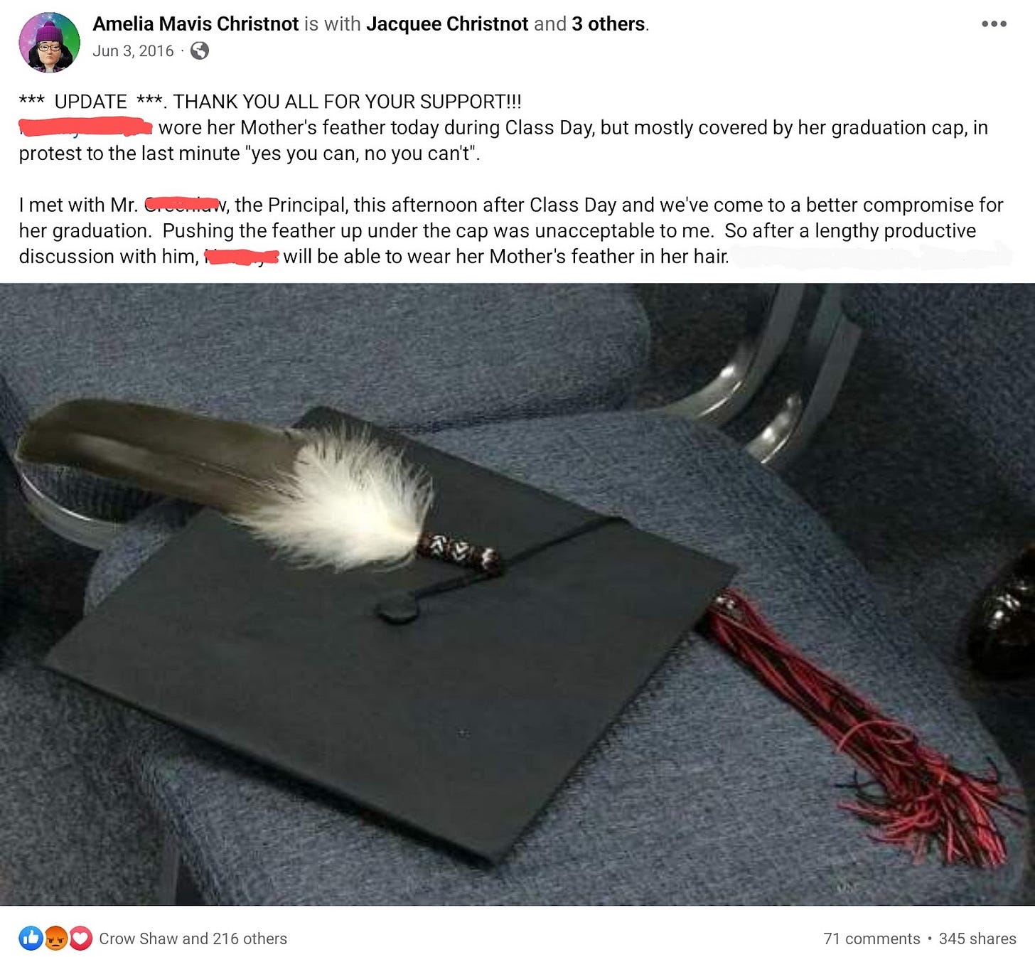 The student was allowed to wear her eagle feather.