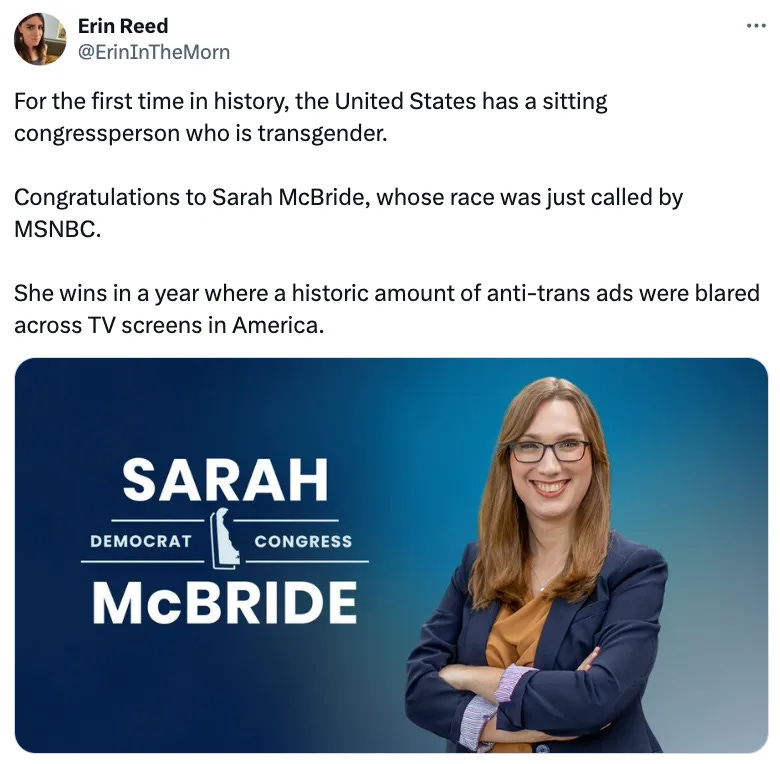 Including Sarah McBride from Delaware, who will become our first openly transgender member of Congress.