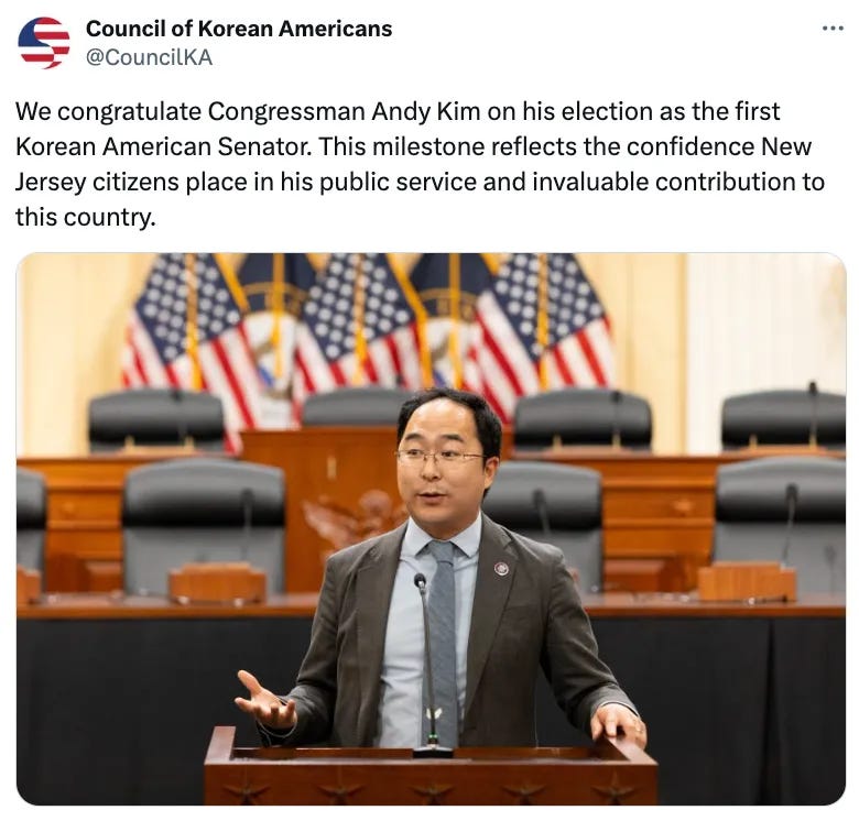 As well as our first Korean American U.S. Senator, Andy Kim of New Jersey.
