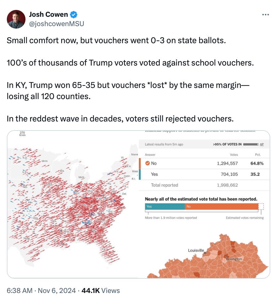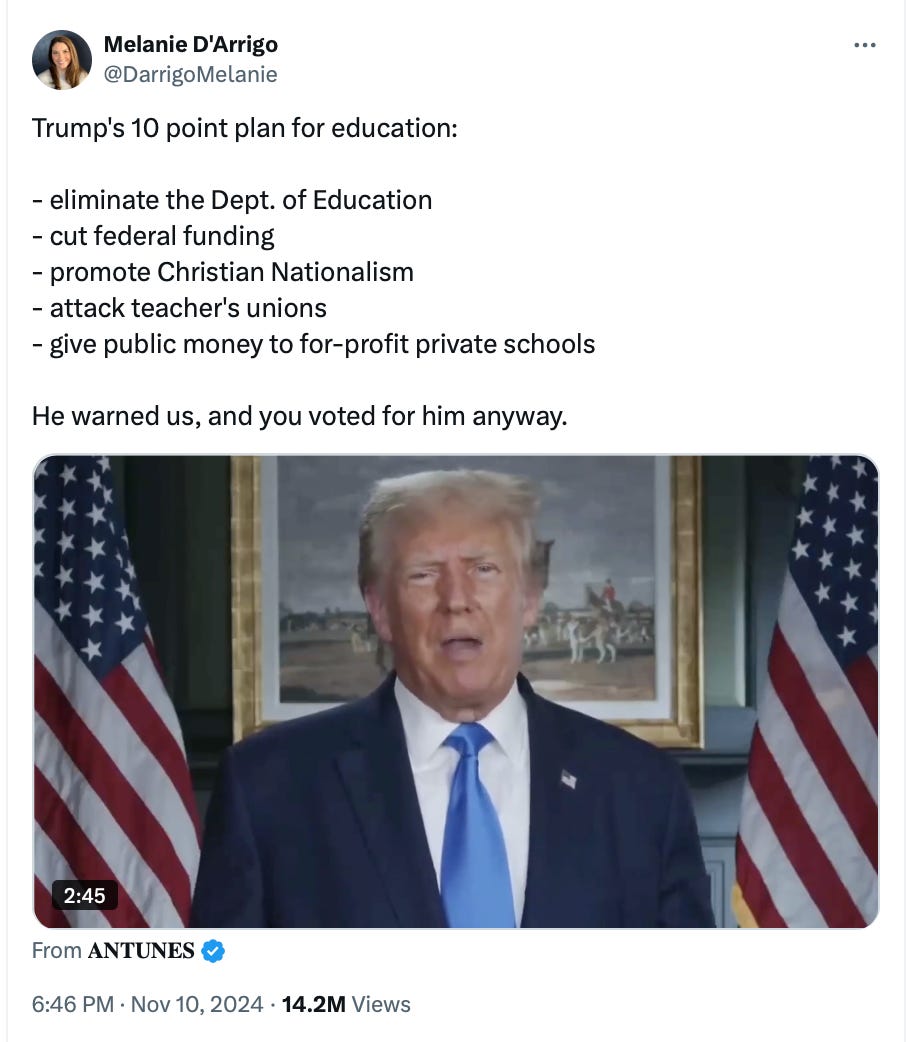 Of course, Trump has already pledged to de-fund the Department of Education and prioritize parental “school choice.” Which is precisely the policy voters rejected.