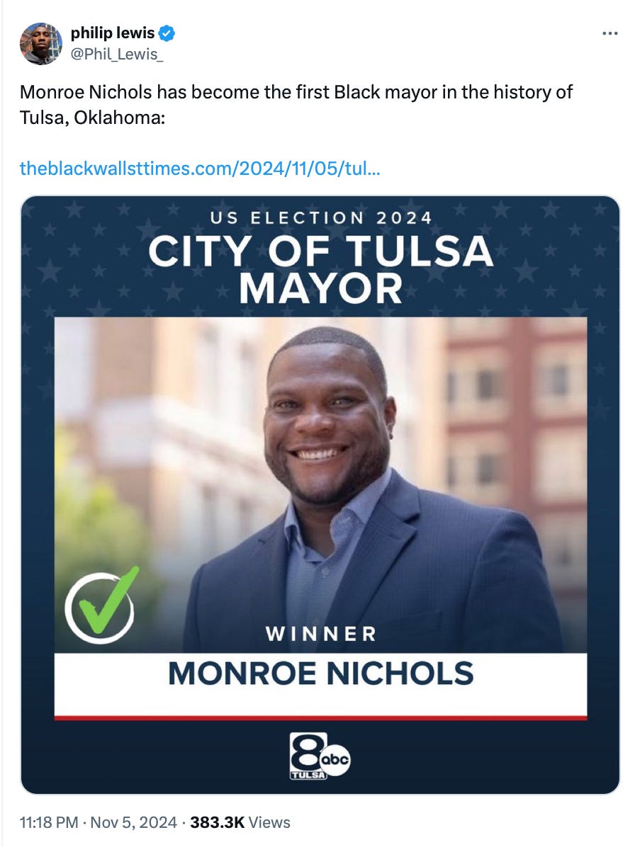 At the local level, we should all be heartened by the election of Monroe Nichols to be the first Black Mayor of Tulsa, Oklahoma, a city where Black businesses were once burned to the ground and its residents terrorized and killed by white mobs.