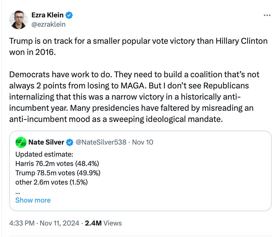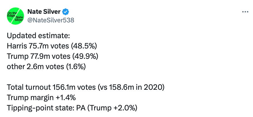 As of this writing, according to CNN, Trump leads Harris by 3.2 million votes, or 50.2% to 48.1% with 95% of the votes counted. With millions of votes left to count, including in very blue parts of California, that margin will close. As of this morning, Nate Silver even suggested that when all is said and done, Trump could end up with under 50% of the vote, with a winning margin of under 1.5%.