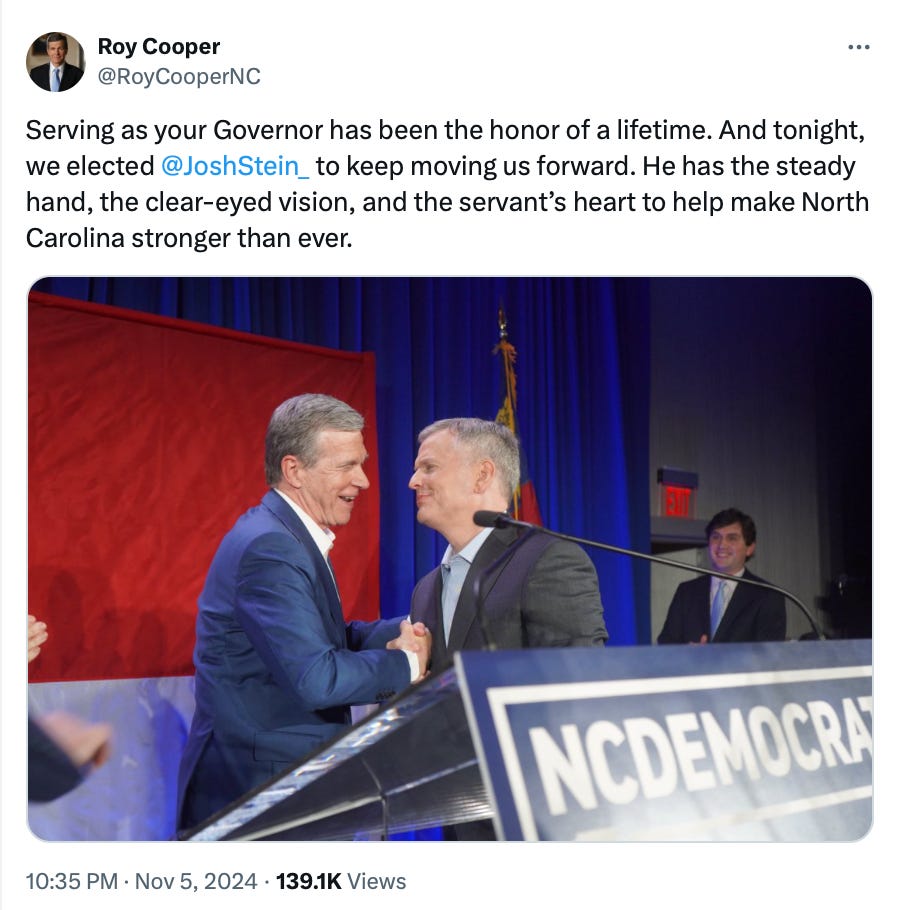 This strong Democratic performance in North Carolina is going to be crucial in 2026 when Senator Thom Tillis is up for reelection (he only won by 3% in 2020) and in 2028 when Sen. Ted Budd is up. Flipping those seats is the path back for Democrats to a Senate majority by 2028. The Harris campaign laid solid groundwork for what Democrats need to do in the next midterms (think 2018 all over again!)