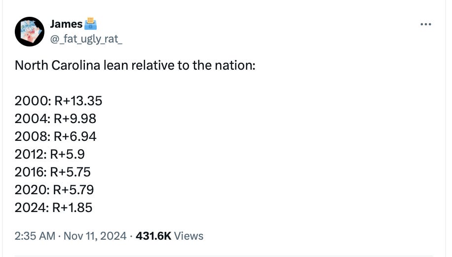 And looking at how the electorates in certain swing states leaned in 2024 relative to the nation as a whole, notice the trend in North Carolina: