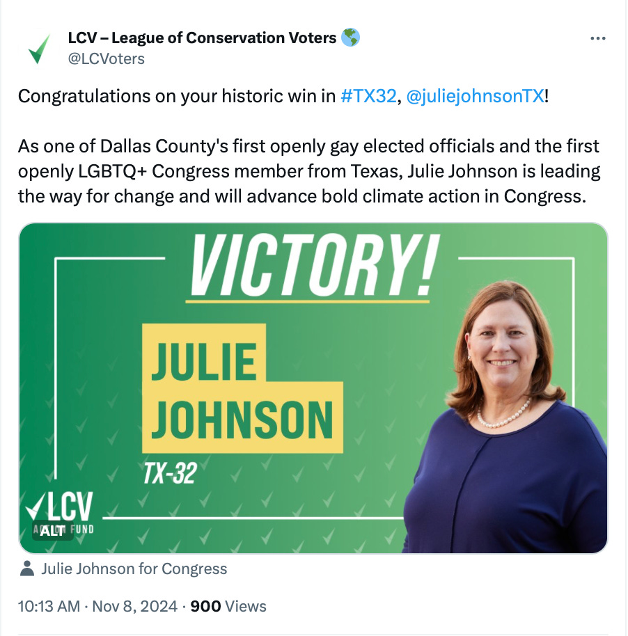 And congratulations to Julie Johnson, who will become the first openly LGBTQ+ member of the U.S. House of Representatives from Texas.