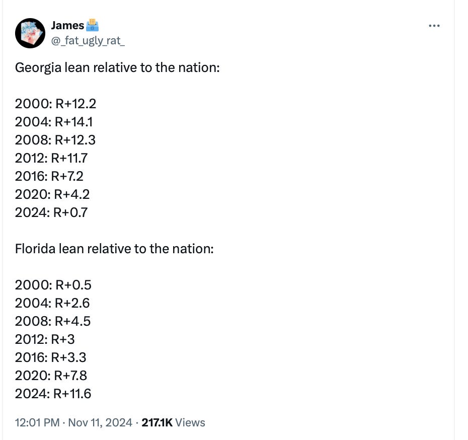 Similarly, look at Georgia’s 2024 partisan lean as compared to Florida’s, where the Harris campaign invested far fewer resources: