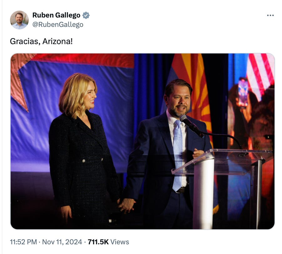 In Arizona, Democratic Rep. Ruben Gallego defeated MAGA election denier Kari Lake for the state’s open U.S. Senate seat by 2.5%.
