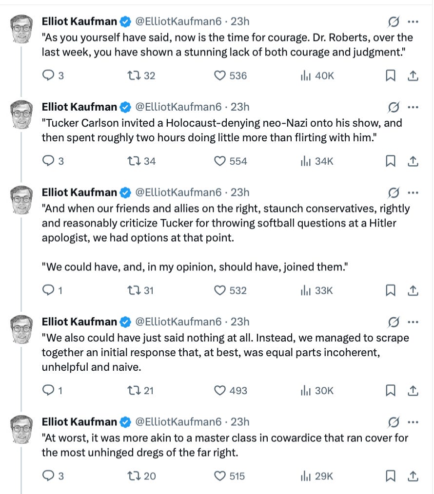 “The issue here isn’t that Tucker Carlson had Nick Fuentes on his show last night. He has every right to do that, of course. The issue here is that Tucker Carlson decided to normalize and fluff Nick Fuentes, and that the Heritage Foundation then decided to robustly defend that performance. Those who criticize both Tucker and Heritage aren’t ‘canceling,’ they are quite properly drawing a moral line.”