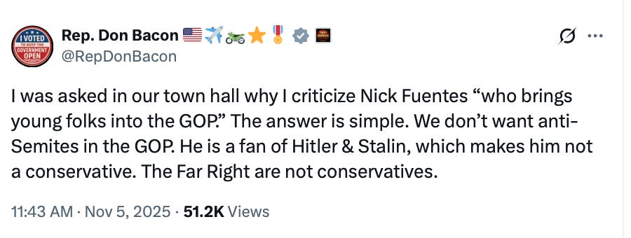 In a post on X yesterday, Rep. Don Bacon (R-NE) revealed his own seeming surprise at the support Fuentes had among his constituents at a recent town hall.