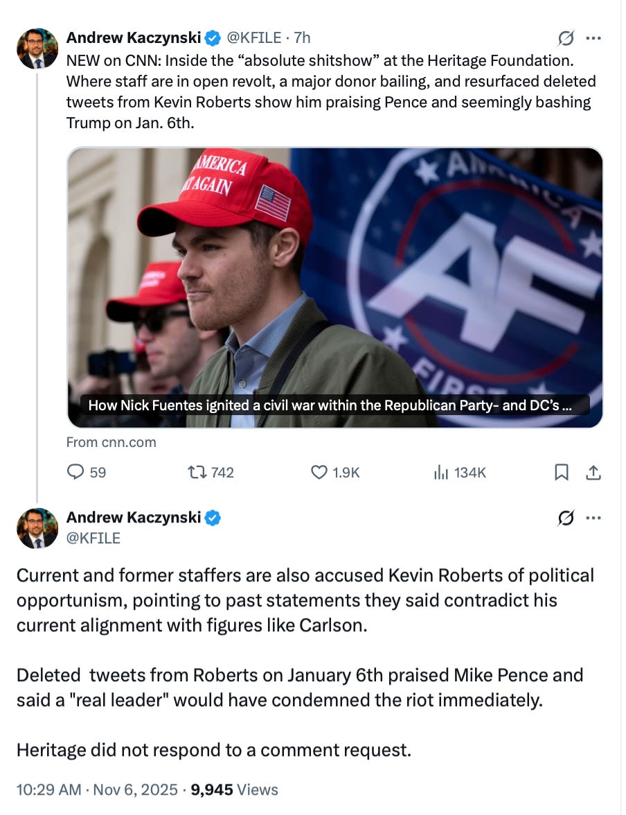 Remarkably, in the midst of these attacks on Carlson, The Heritage Foundation—arguably the most influential think tank of the conservative movement—actually came to Carlson’s defense. Its president, Kevin Roberts, a key architect of Project 2025, posted a video on X just days after Carlson’s Fuentes interview, excoriating those who would try to “cancel” Carlson, calling him “a friend” of the foundation.