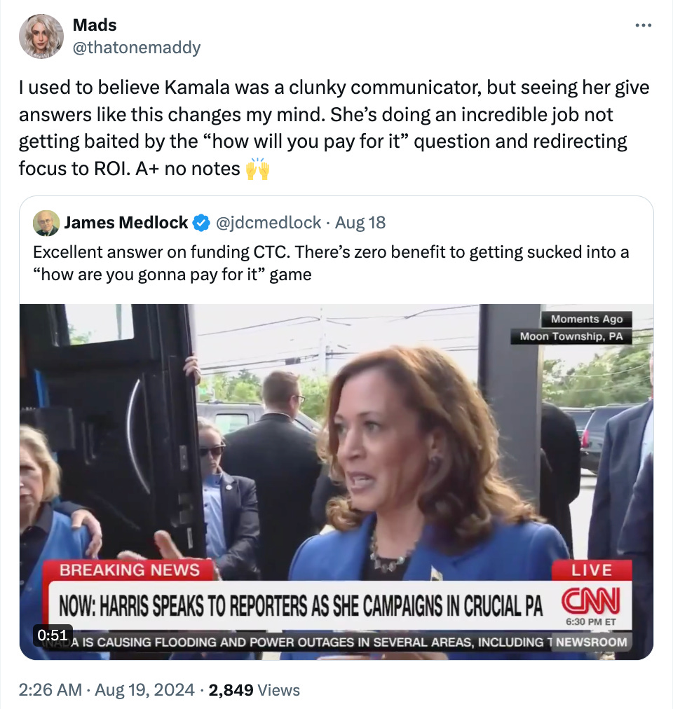 Not only did Harris choose to lean into the issue seen as the biggest driver of discontent among voters, e.g. the economy and high prices, but she also leaned into popular and populist policies that don’t diverge from President Biden as much as they build on what his administration has already done.