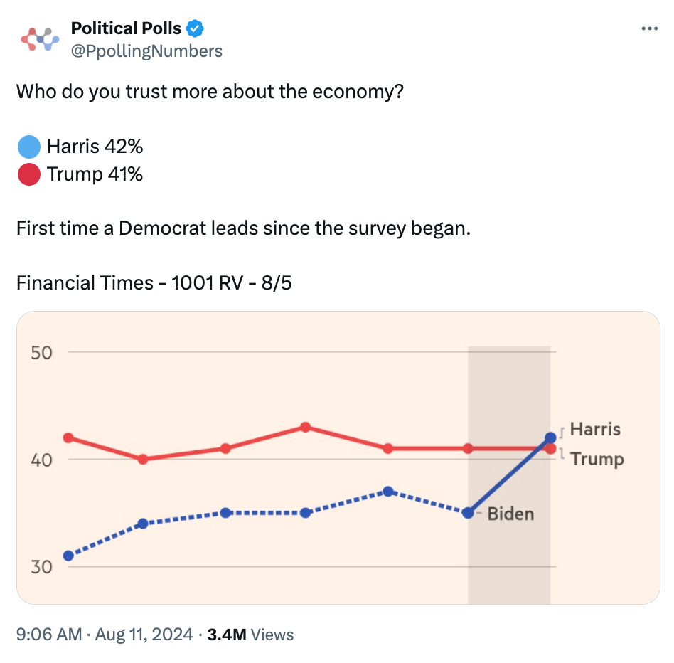 Look at this Financial Times poll from earlier this month, well before last week’s event, which finds Harris overtaking Trump on the issue of who is most trusted on the economy.