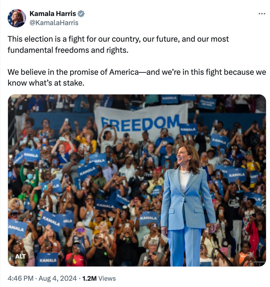 This dichotomy is the central premise of her very first ad, in which she, appropriately, secured the rights to Beyoncé’s anthem “Freedom”—which is also Harris’s walk-on song for her rallies—and in which she powerfully reclaims the mantle of freedom for Democrats, saying:
