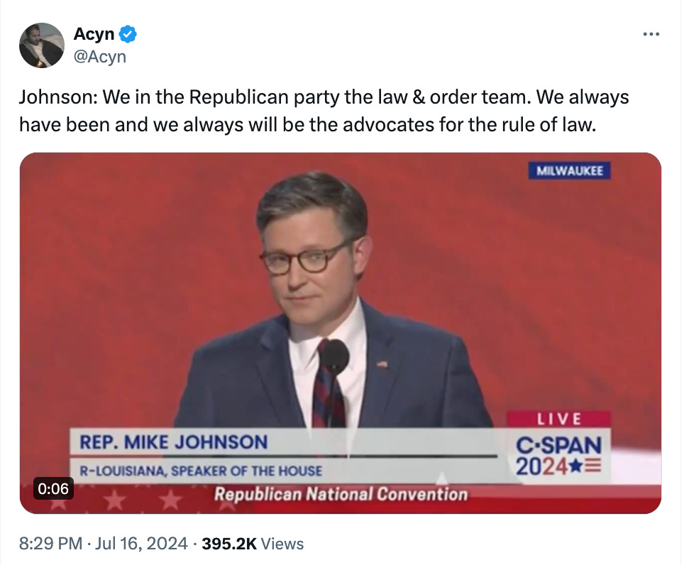After Donald Trump incited a riot on the Capitol on January 6th, 2021, after he called the rioters “hostages” and pledged to pardon them, after Trump was found liable for sexual abuse, financial fraud, convicted of 34 counts of falsifying financial documents to illegally win the 2016 election, and after he was indicted for corruptly trying to overturn the 2020 election as well as stealing classified government documents, no longer do Republicans get to claim, as Speaker Mike Johnson said with a straight face at the Republican National Convention: