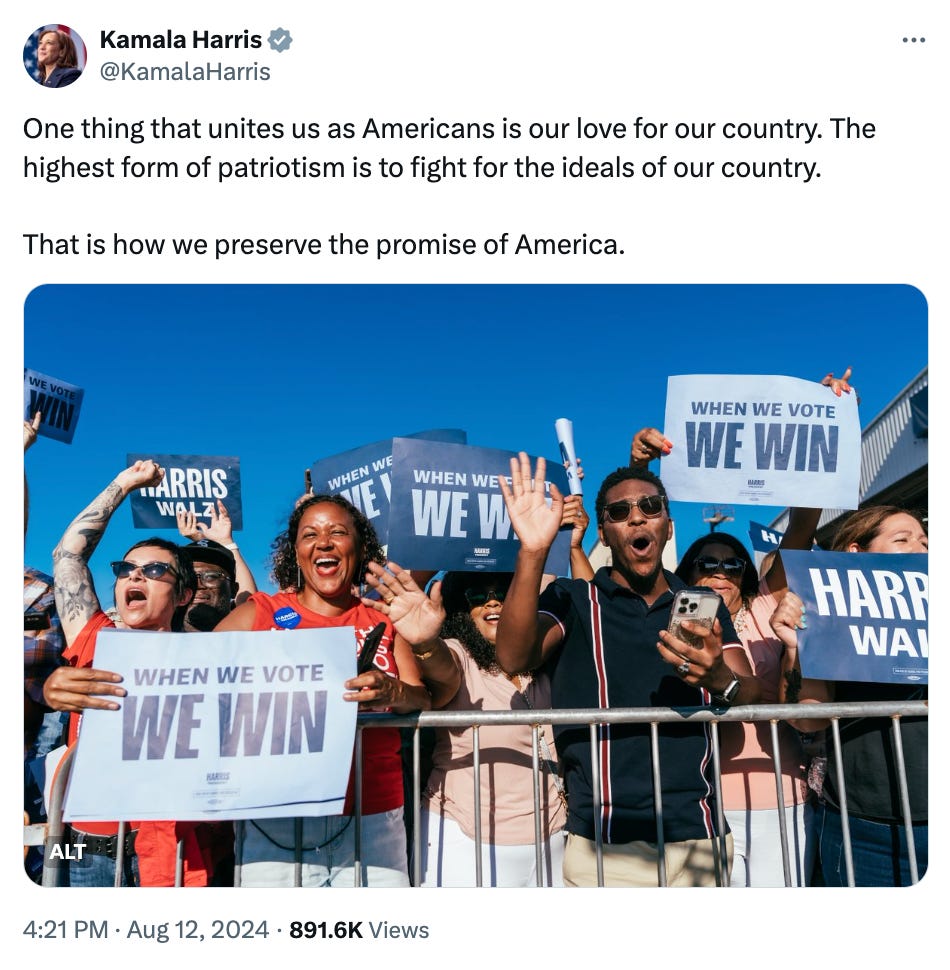 As Donald Trump and JD Vance spread their message of doom and gloom, the so-called “America first” folks have given Democrats an opening and Harris is barging right through it. She has not just masterfully recast Democrats as the true fighters of freedom, but has made the case for why we should be optimistic about our country again, and dare we even say…patriotic.
