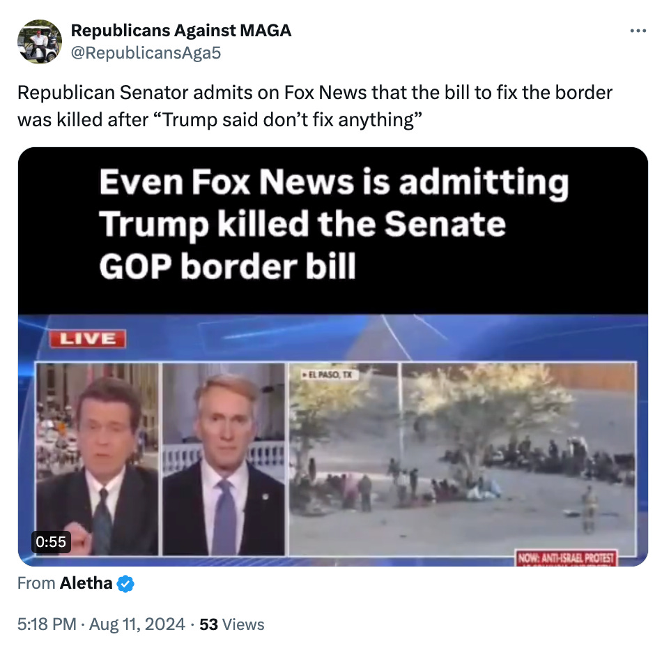 And we all know what happened next. Against all odds, a tough immigration bill was successfully negotiated, Biden pledged to sign it, and Trump predictably scuttled it by pressuring Republicans in Congress to kill the deal.