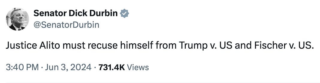 On May 17, 2024, in the wake of news that Justice Alito had flown an upside-down American flag outside his residence, Senator Dick Durbin, Chairman of the Senate Judiciary Committee, called on Alito to recuse himself from Trump-related cases before the Court.