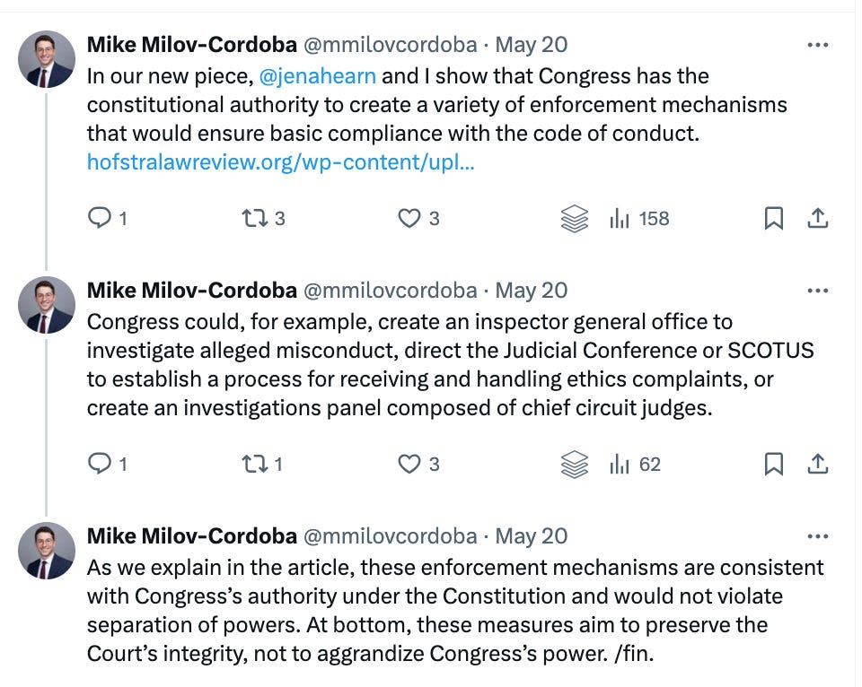 The Brennan Center’s Mike Milov-Cordoba laid out a basic enforcement mechanism Congress could set up to give the Court’s code of ethics some actual teeth in this X thread.