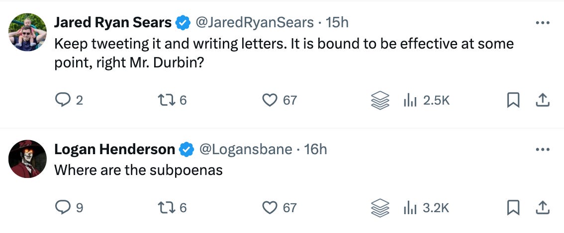 Then, after the second Alito flag was reported, Durbin and Senator Sheldon Whitehouse, who is Chair of the Subcommittee on Federal Courts, wrote to Chief Justice Roberts urging him to compel Justice Alito to recuse.