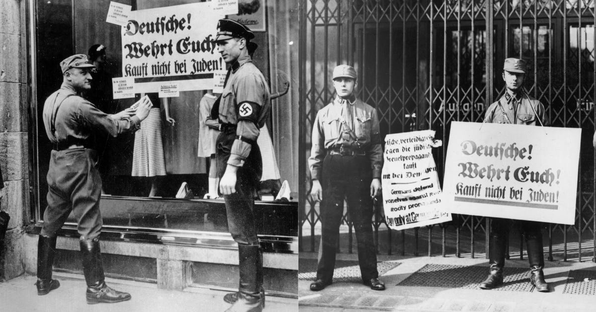 Let’s look at a time when similar tactics were underway. Two months after Hitler came to power in Germany, he called for a national, one-day boycott of Jewish stores and businesses. It was the beginning of an effort to erase Jews from civil society.