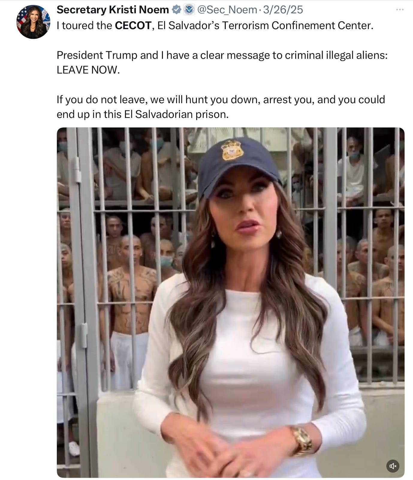 Secretary Noem infamously filmed herself before barechested prisoners packed into the notorious El Salvador prison, bragging that the CECOT facility is “one of the tools in our toolbox” and warning that “if you come to our country illegally, this is one of the consequences you could face.”