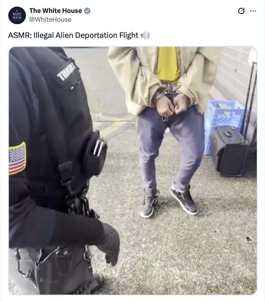 When flights bearing migrants to El Salvador began, the White House put out a video depicting the preparation and use of chains and shackles upon migrants being rendered or deported. Along with the video, it used the acronym ASMR, which stands for “Autonomous Sensory Meridian Response.”