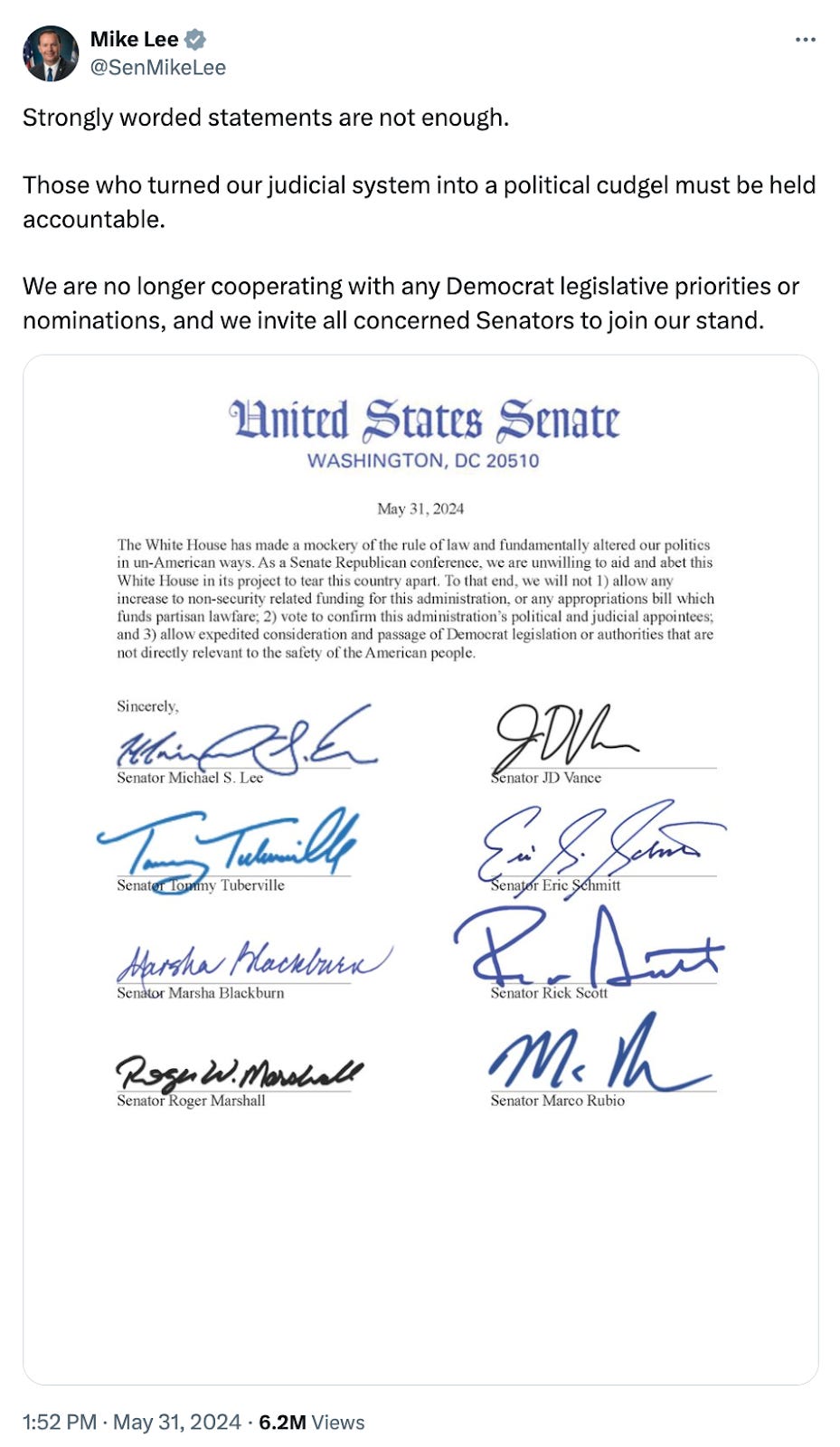 In the wake of Trump’s guilty verdicts by a jury of his peers, 10 Republican Senators have vowed to bring the U.S. Senate to a halt, releasing a letter pledging to block President Biden’s funding requests and political appointments, all based on the false notion that he was somehow behind the prosecution.