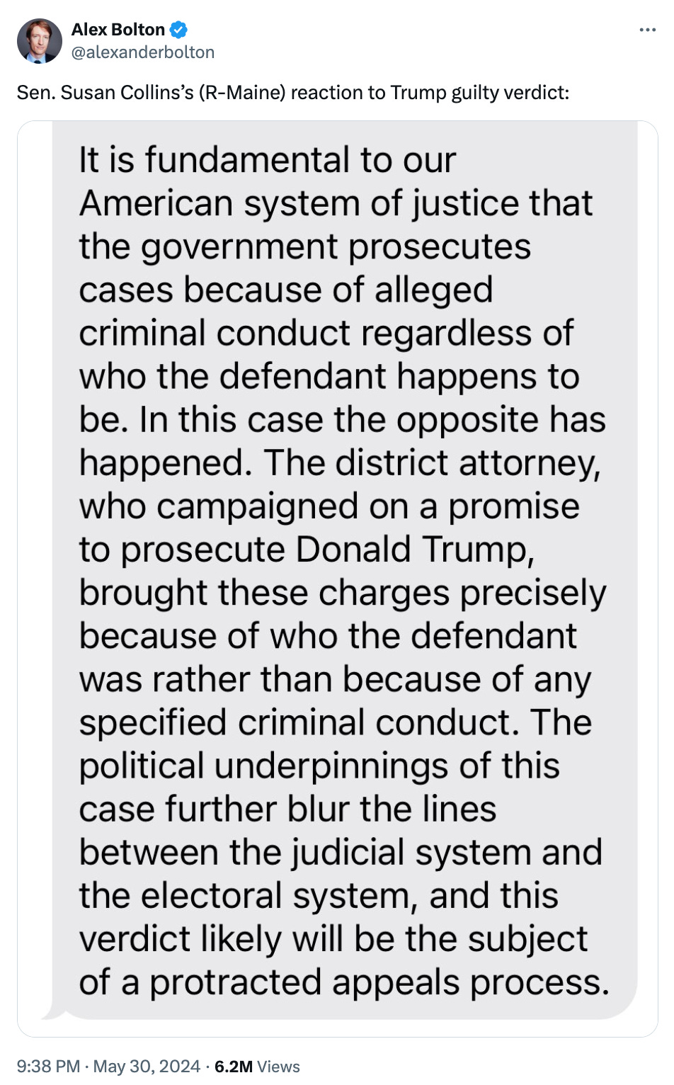 But even a moderate Republican like Sen. Susan Collins (R-ME), who is no fan of Trump, seems to be making the case that there is no instance in which Trump can be legitimately prosecuted for crimes.
