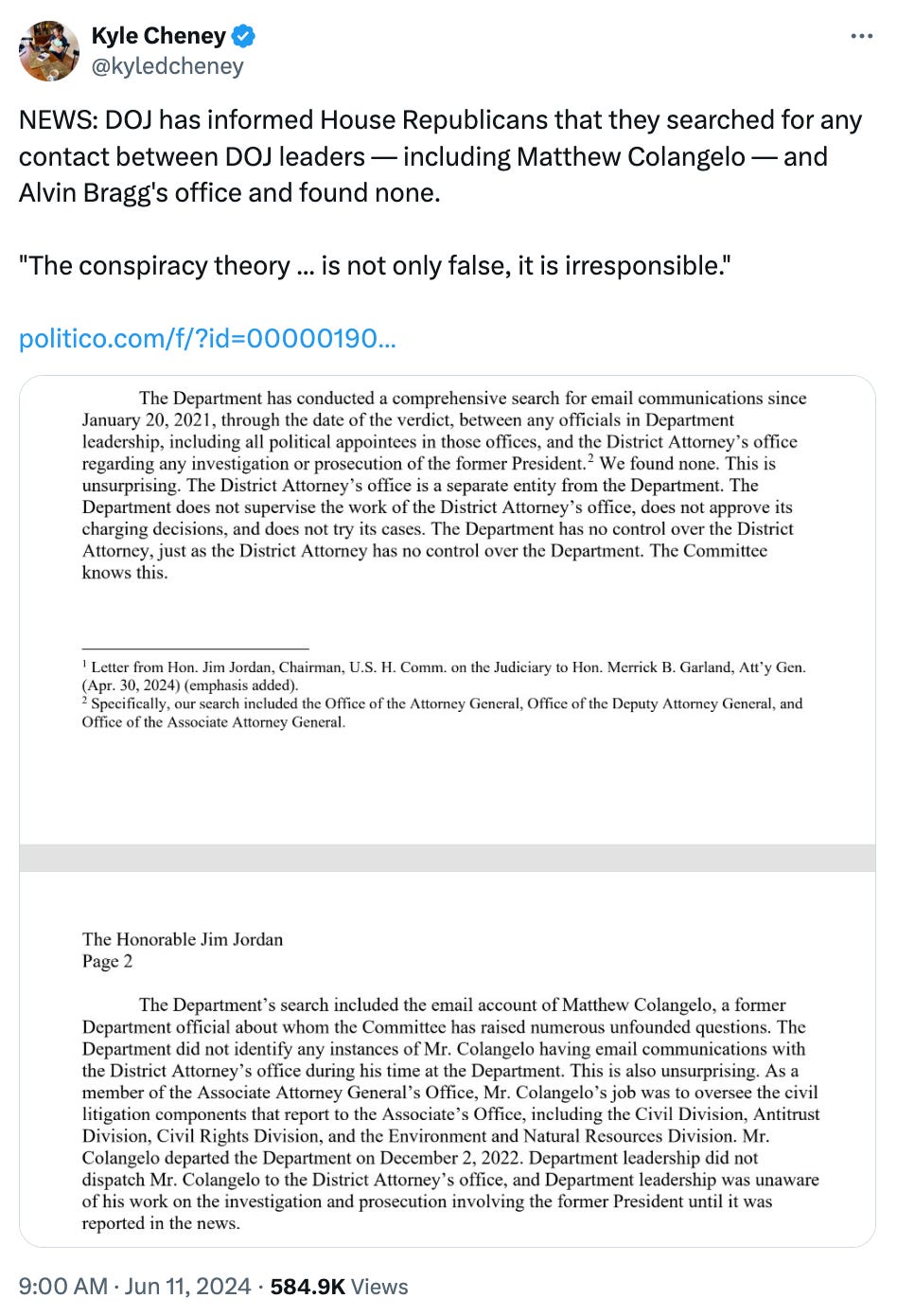 In April, House Judiciary Committee Chair Jim Jordan (R-OH) sent the Department of Justice a letter calling on them to defend against what he called “Justice Department Coordination with Alvin Bragg's Politicized Prosecution.”