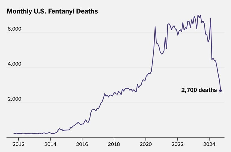 This helps explain why Trump goes on and on about fentanyl smuggling and migrant border crossings, even though deaths from fentanyl and migrant border crossings are way down.